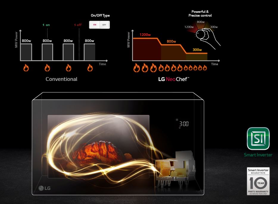 – เทคโนโลยี Smart Inverter ที่จะช่วยให้ไมโครเวฟของเพื่อนๆ สามารถปรับกำลังไฟให้คงที่ในการอุ่นอาหาร หรือละลายน้ำแข็ง ช่วยลดระยะเวลาในการทำอาหารด้วยกำลังไฟกว่า 1,000 วัตต์ และยังช่วยให้เพื่อนๆทำอาหารได้หลากหลายชนิด อีกทั้งยังช่วยประหยัดไฟมากกว่าไมโครเวฟทั่วไปอีกด้วย