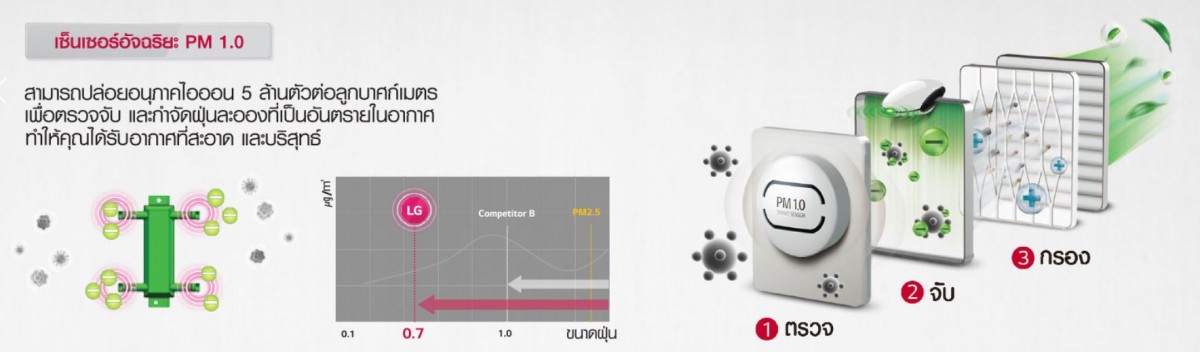 Air Purifying System คือ เซ็นเซอร์อัจฉริยะ PM 1.0 ที่มีประสิทธิภาพทำให้เครื่องปรับอากาศมาพร้อมกับระบบฟอกอากาศ สามารถตรวจจับฝุ่นละอองที่มีขนาดเล็กกว่า 1.0 ไมโครเมตร ได้เป็นอย่างดี