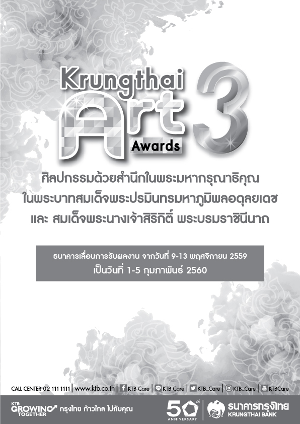 ธนาคารกรุงไทย ประกาศเลื่อนกำหนดรับผลงานจิตรกรรม ภาพพิมพ์ และประติมากรรมที่เข้าร่วมการประกวดศิลปกรรมกรุงไทย ครั้งที่ 3 ประจำปี 2559 เป็นวันที่ 1-5 กุมภาพันธ์ 2560 ผู้ชนะการประกวดจะได้รับโล่พระราชทานสมเด็จพระเทพรัตนราชสุดาฯ สยามบรมราชกุมารี พร้อมเงินรางวัลมูลค่ารวมทั้งสิ้น3,000,000 บาท และเกียรติบัตร